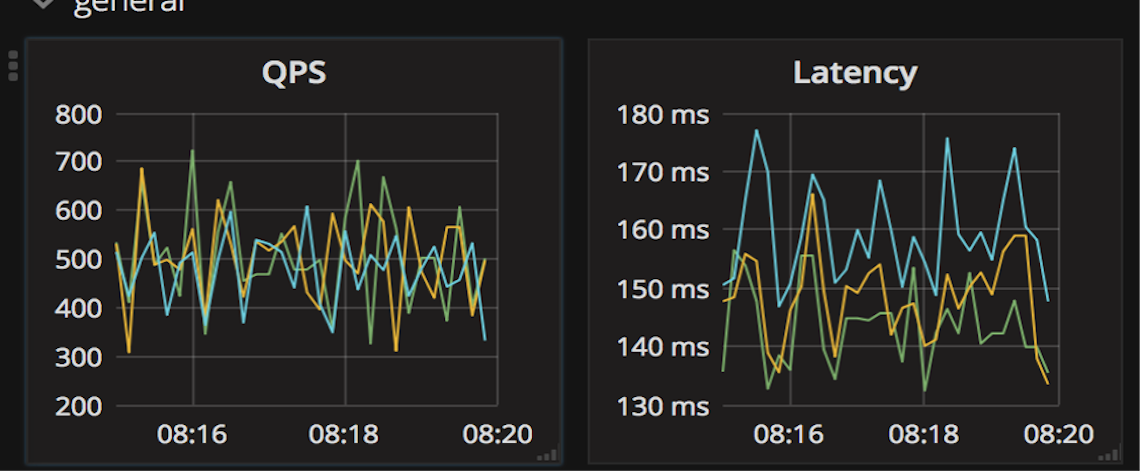 下面这张图是网络延时的监控图,图里蓝色的线表示程序运行在veth容器中,黄色线表示程序运行在ipvlan的容器里,绿色的线代表程序直接运行在物理机上。