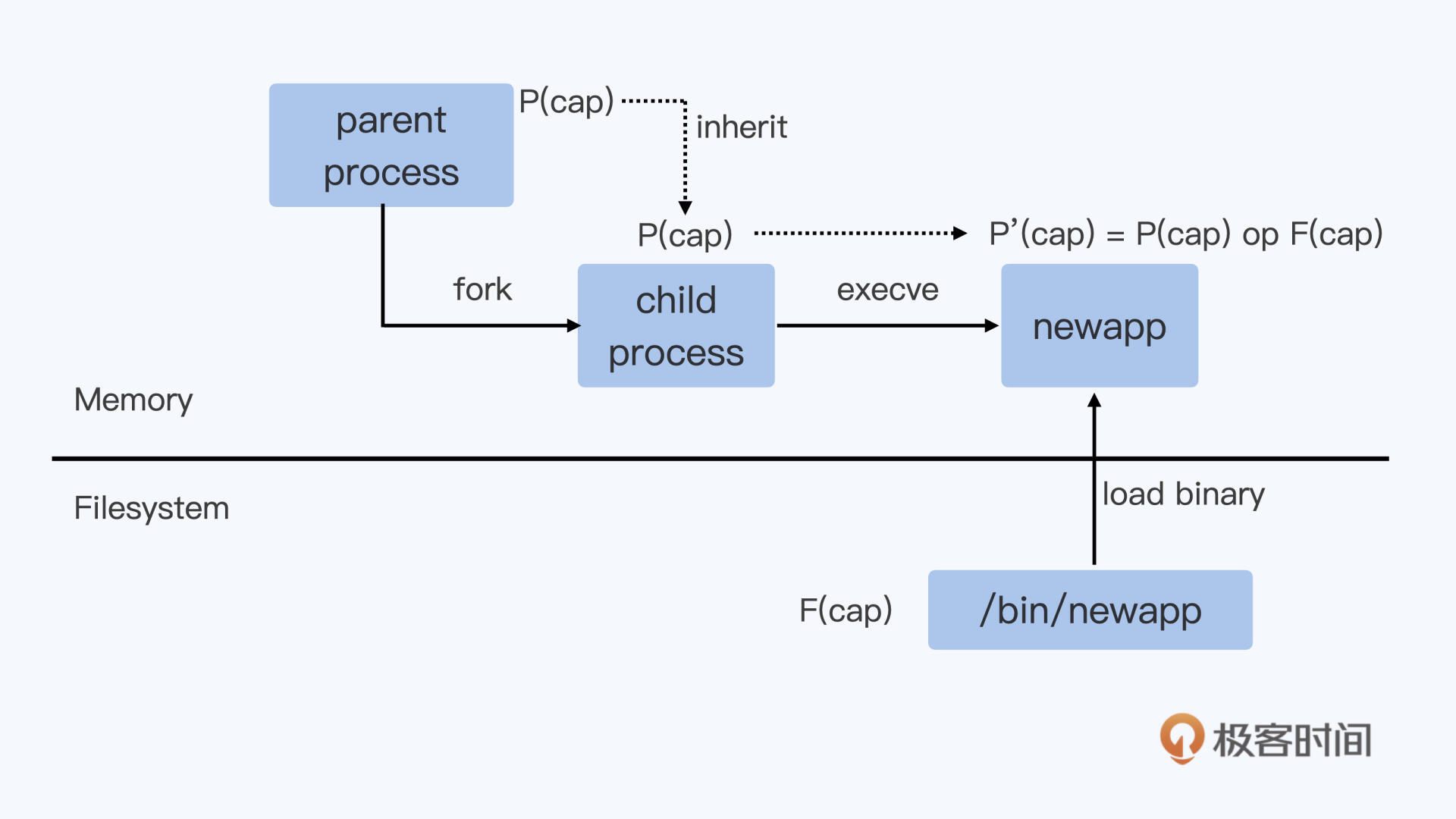 这里你只要记住最重要的一点,文件中可以设置capabilities参数值,并且这个值会影响到最后运行它的进程。比如,我们如果把iptables的应用程序加上 CAP_NET_ADMIN的capability,那么即使是非root用户也有执行iptables的权限了。