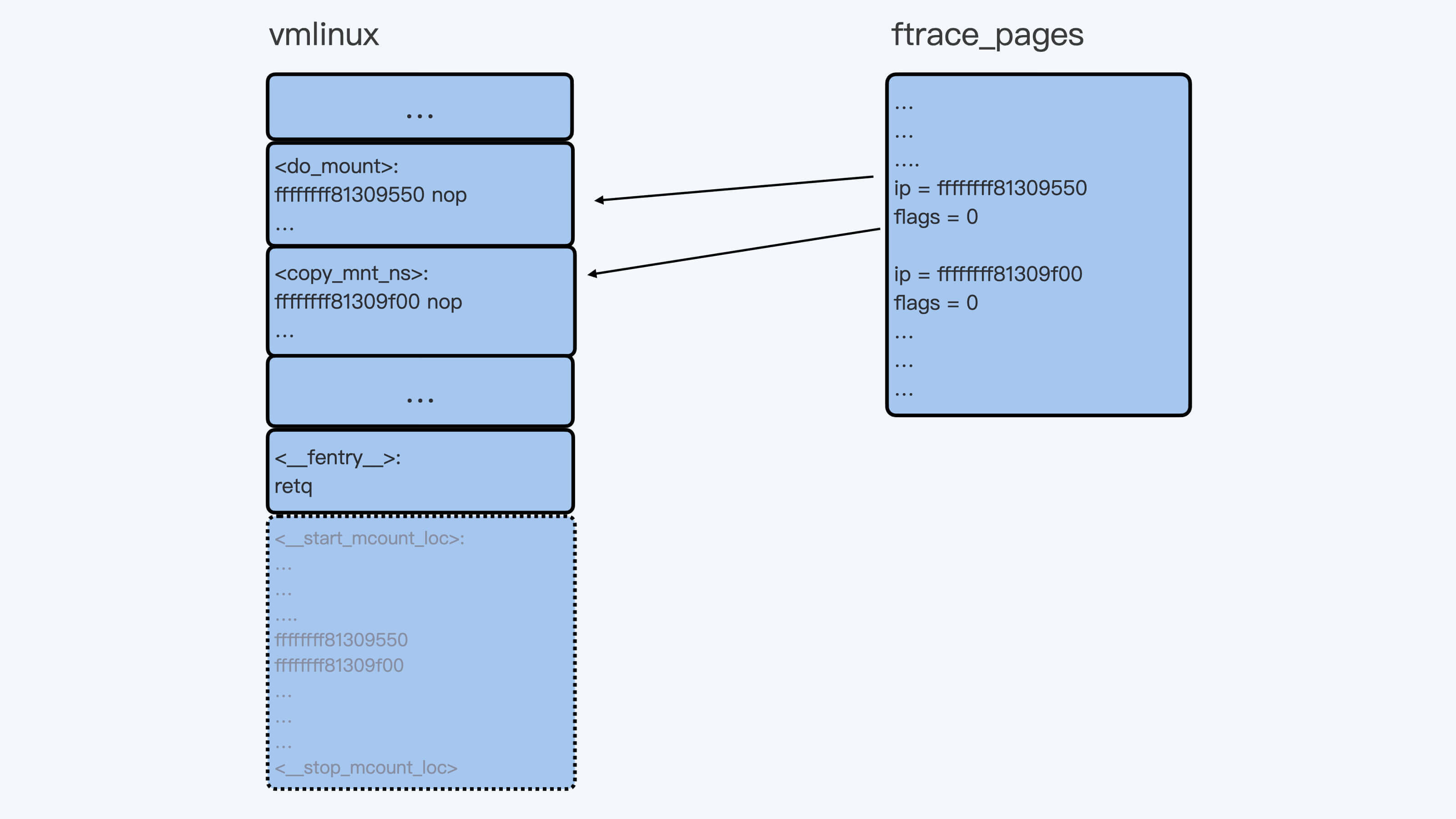 因此,在内核启动初始化的时候,ftrace又申请了新的内存来存放mcount_loc段中原来的地址信息,外加对每个地址的控制信息,最后释放了原来的mcount_loc段。