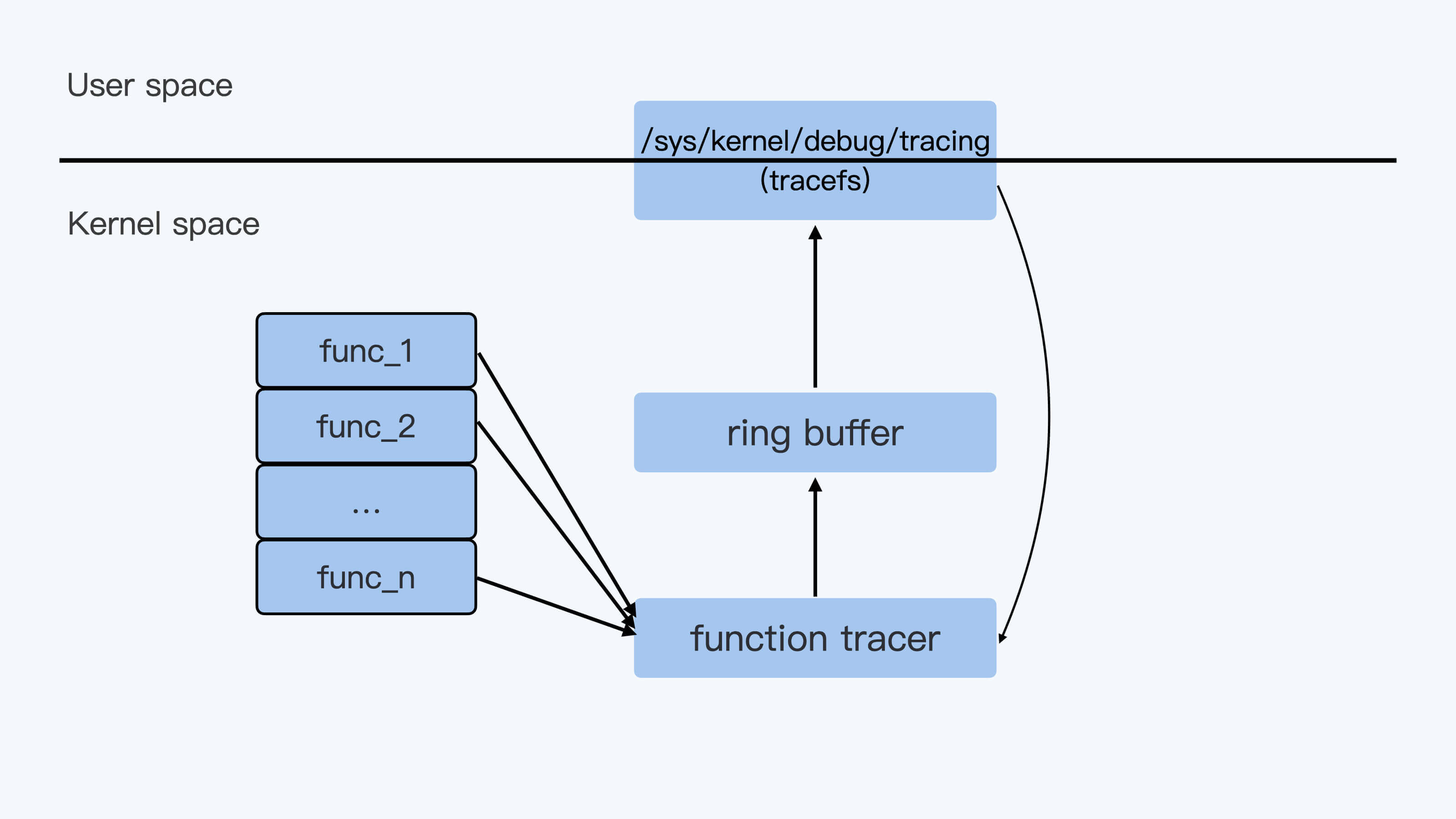 下面这张图描述了ftrace实现的high level的架构,用户通过tracefs向内核中的function tracer发送命令,然后function tracer把收集到的数据写入一个ring buffer,再通过tracefs输出给用户。