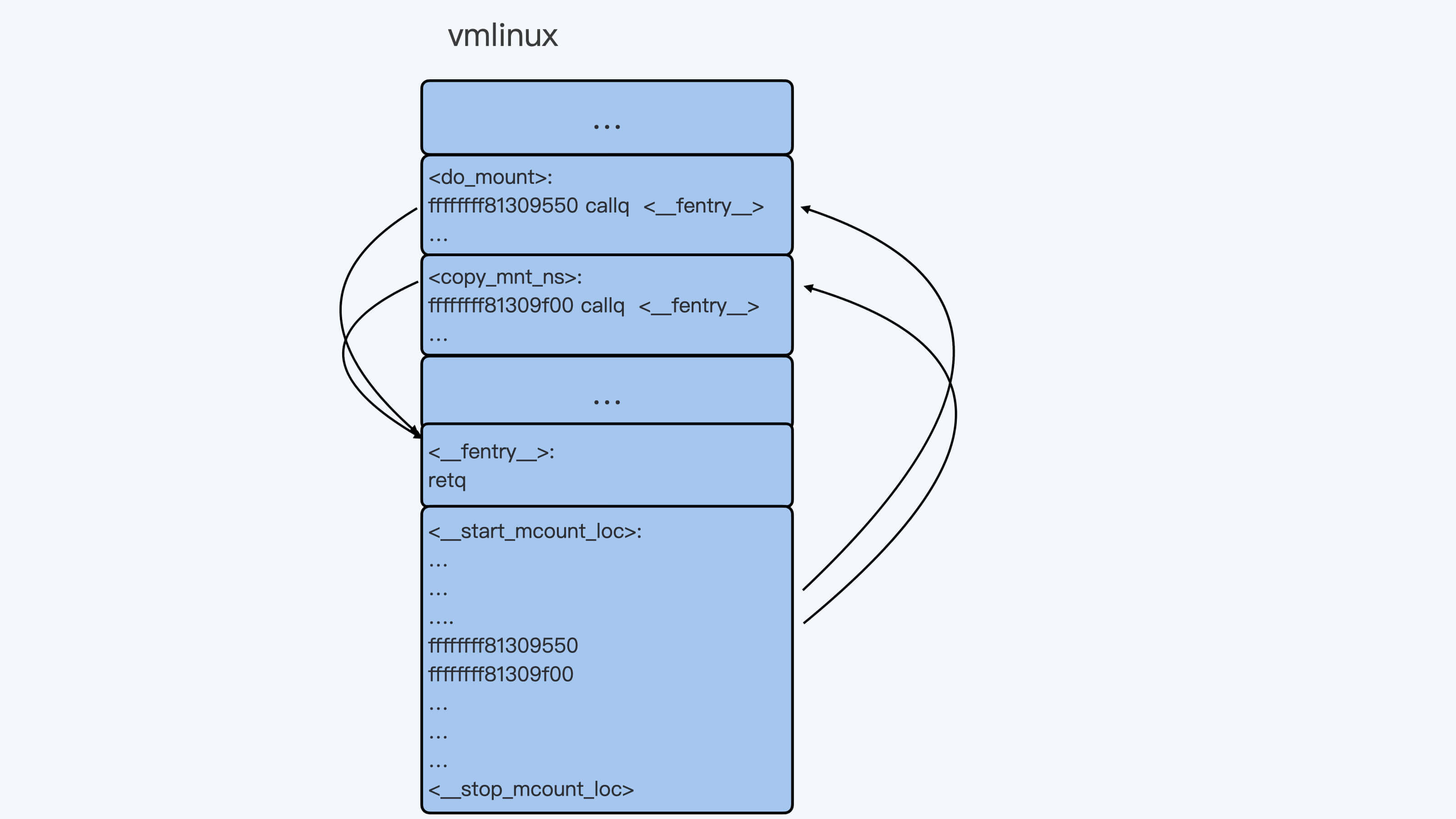 而"-mrecord-mcount"参数在最后的内核二进制文件vmlinux中附加了一个mcount_loc的段,这个段里记录了所有"callq <fentry>"指令的地址。这样我们很容易就能找到每个函数的这个入口点。