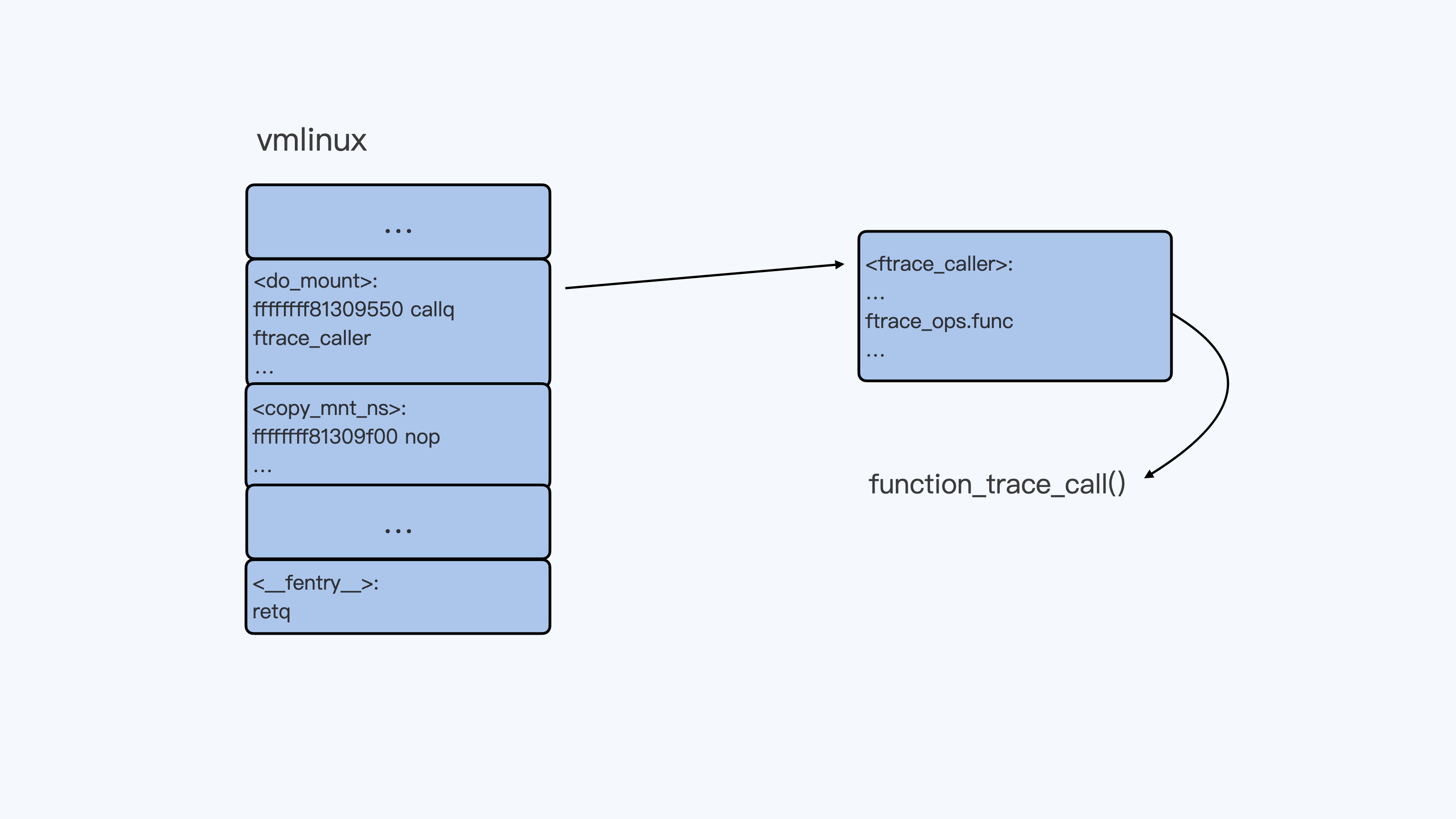 ftrace在内核启动的时候做了一件事,就是把内核每个函数里的第一条指令"callq <fentry>"(5个字节),替换成了"nop"指令(0F 1F 44 00 00),也就是一条空指令,表示什么都不做。