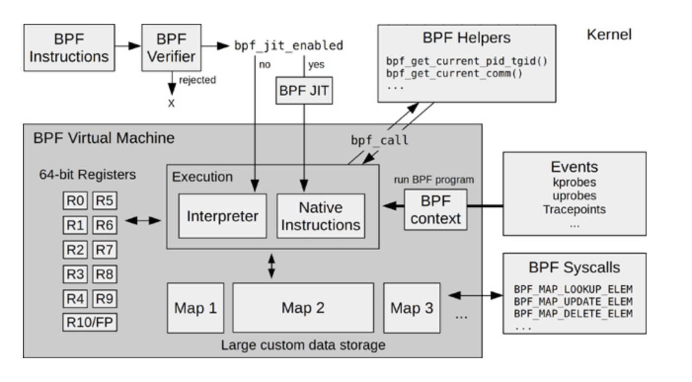 执行BPF程序之前,BPF Verifier先要对eBPF bytecode进行很严格的指令检查。检查通过之后,再通过JIT(Just In Time)编译成宿主机上的本地指令。