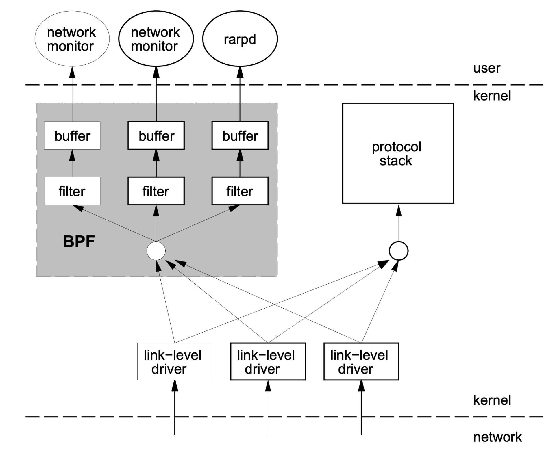 那BPF是怎样从内核中抓取数据包的呢?我借用BPF论文中的图例来解释一下: