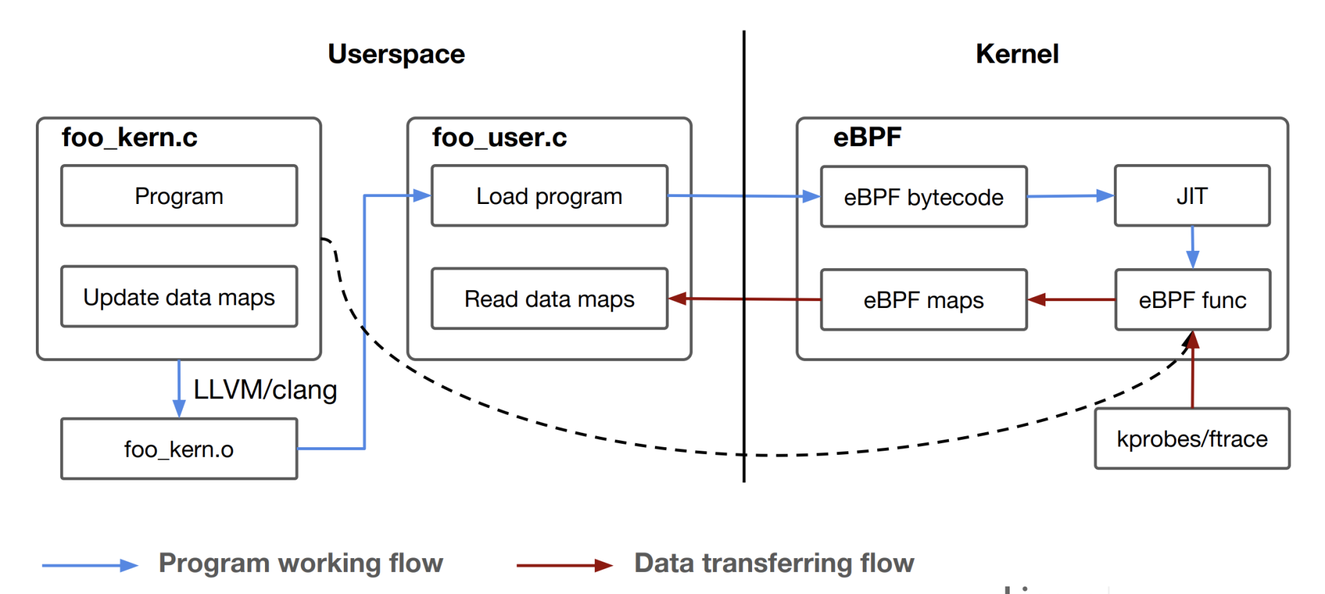 eBPF的程序都分为两部分,一是内核态的代码最后会被编译成eBPF bytecode,二是用户态代码,它主要是负责加载eBPF bytecode,并且通过eBPF Maps与内核态代码通讯。