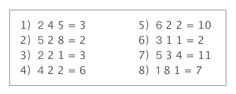 如果你暂时没有答案也没关系,我们来做一个小测验,下面有8个等式,请你通过分析这8个等式的规律,解答“8 1 3 = ?”。