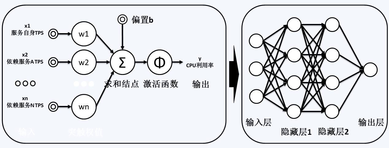 下图左边部分是一个典型的神经元,我们将服务自身的TPS、依赖服务的各TPS作为输入,引入神经元,每个输入需要乘以一定的权重w后进行求和,再与一个外部的偏置b(可以认为是一个没有输入的权重)相加,得到最终的总和结果,将这个结果投入一个激活函数进行转换(用来保证结果落在规定的区间内),最终得到我们需要的输出,即服务的CPU利用率。