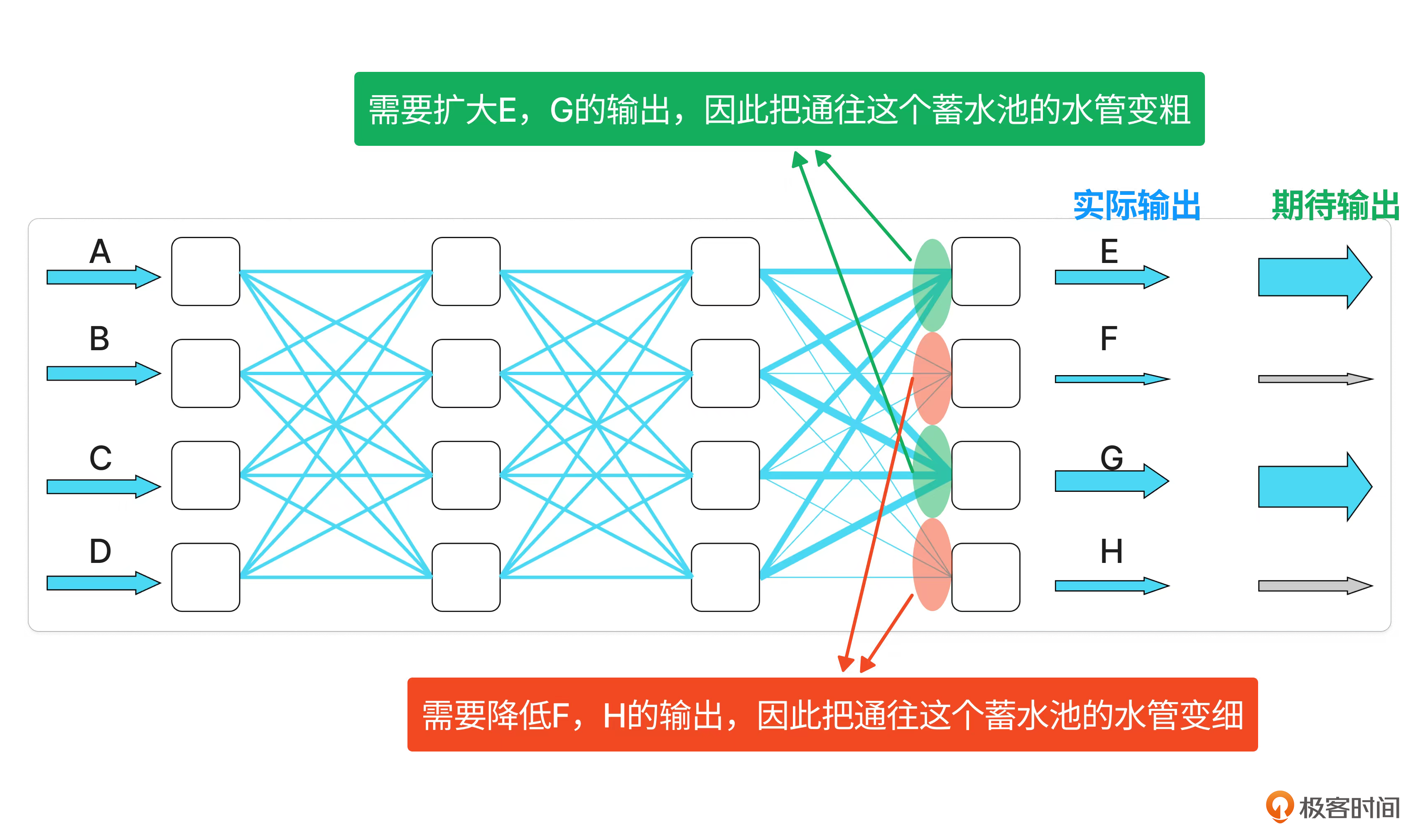 而这种不一致就会作为反馈告诉上游的水管:“某些管道要变粗一点,某些管道要变细一点。”这种将期待值与实际输出值的差异作为信号向上游反馈的过程叫做“反向传播”。