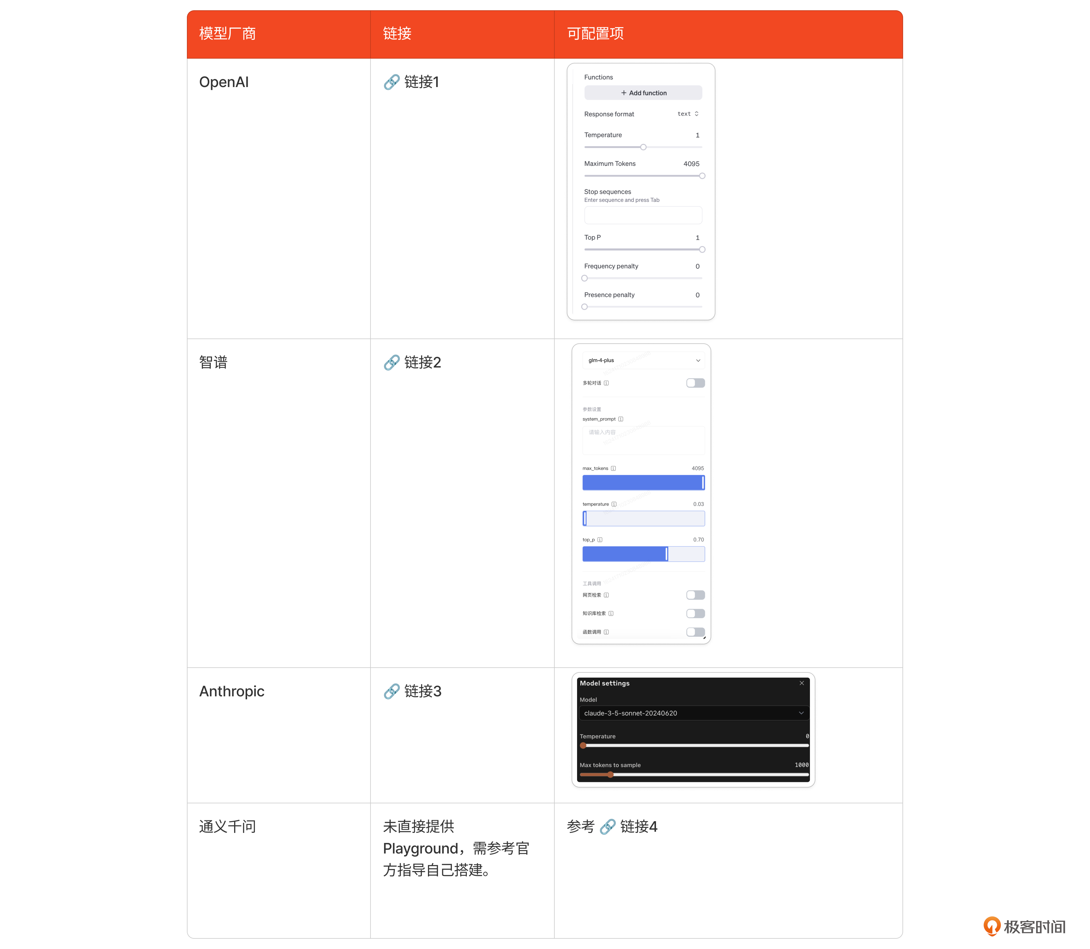其中,OpenAI的Playground配置项是目前最全的,我们就以此为例具体说明。