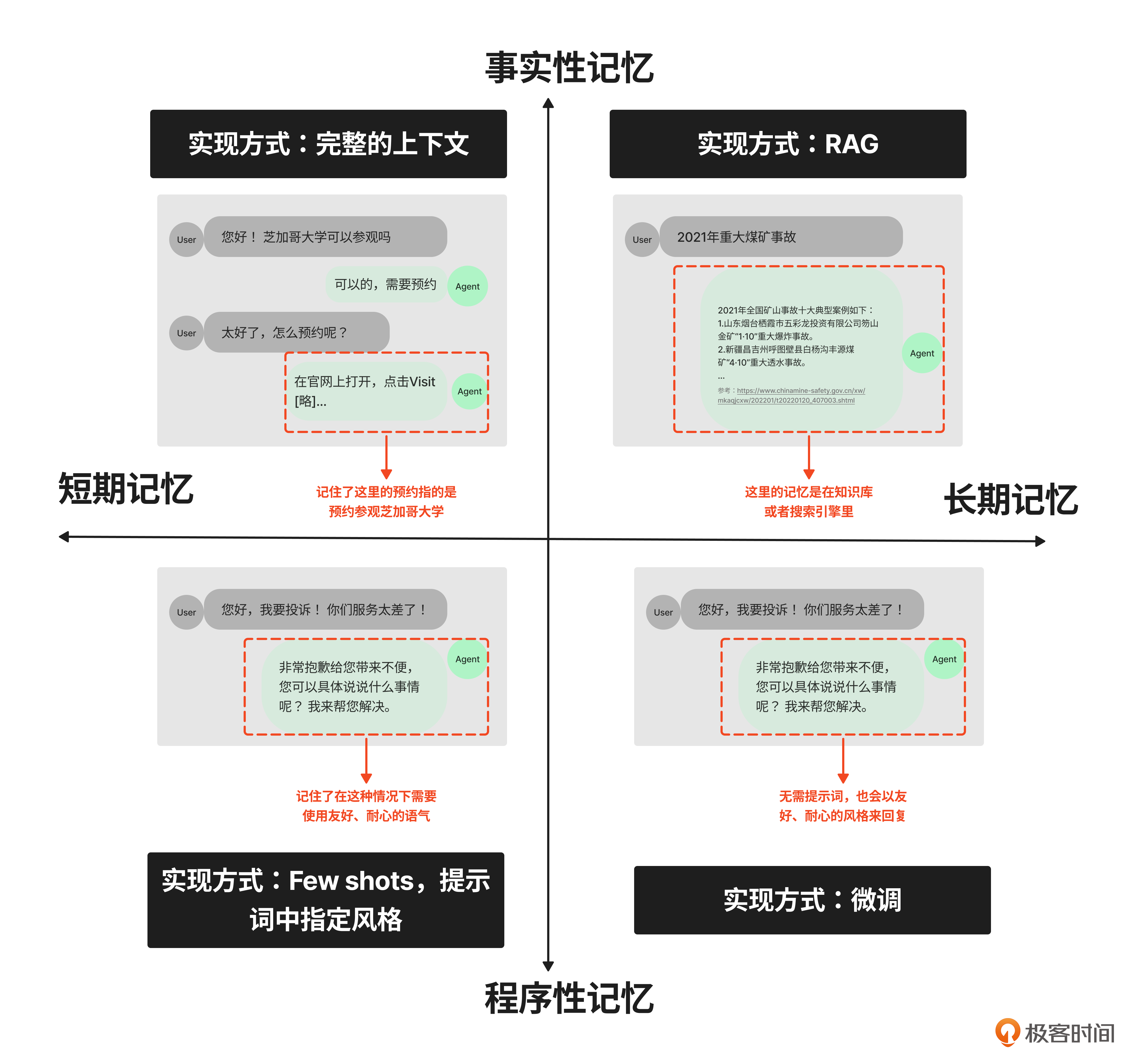 将这两个维度正交,就得到了四个象限。每个象限里的记忆能力在Agent里都有具体的实现方式,我标注在了图里。你可以看到,我们通过Hard Prompting(提示词工程)、Soft Prompting(微调)和RAG就可以构建起Agent的记忆能力。