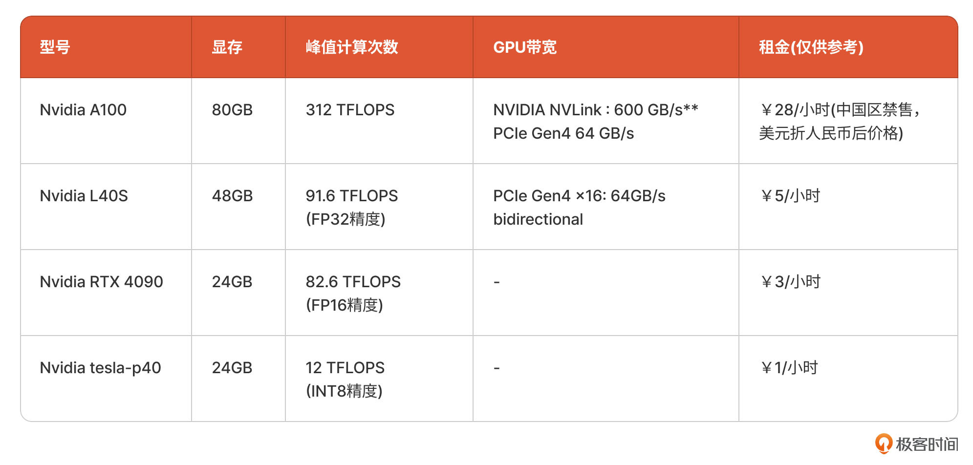 按照这三个指标,会有不同的GPU云端资源,也对应着不同的租金价格。我在这里列出了几款常见英伟达GPU芯片的关键指标和价格,你可以参考。