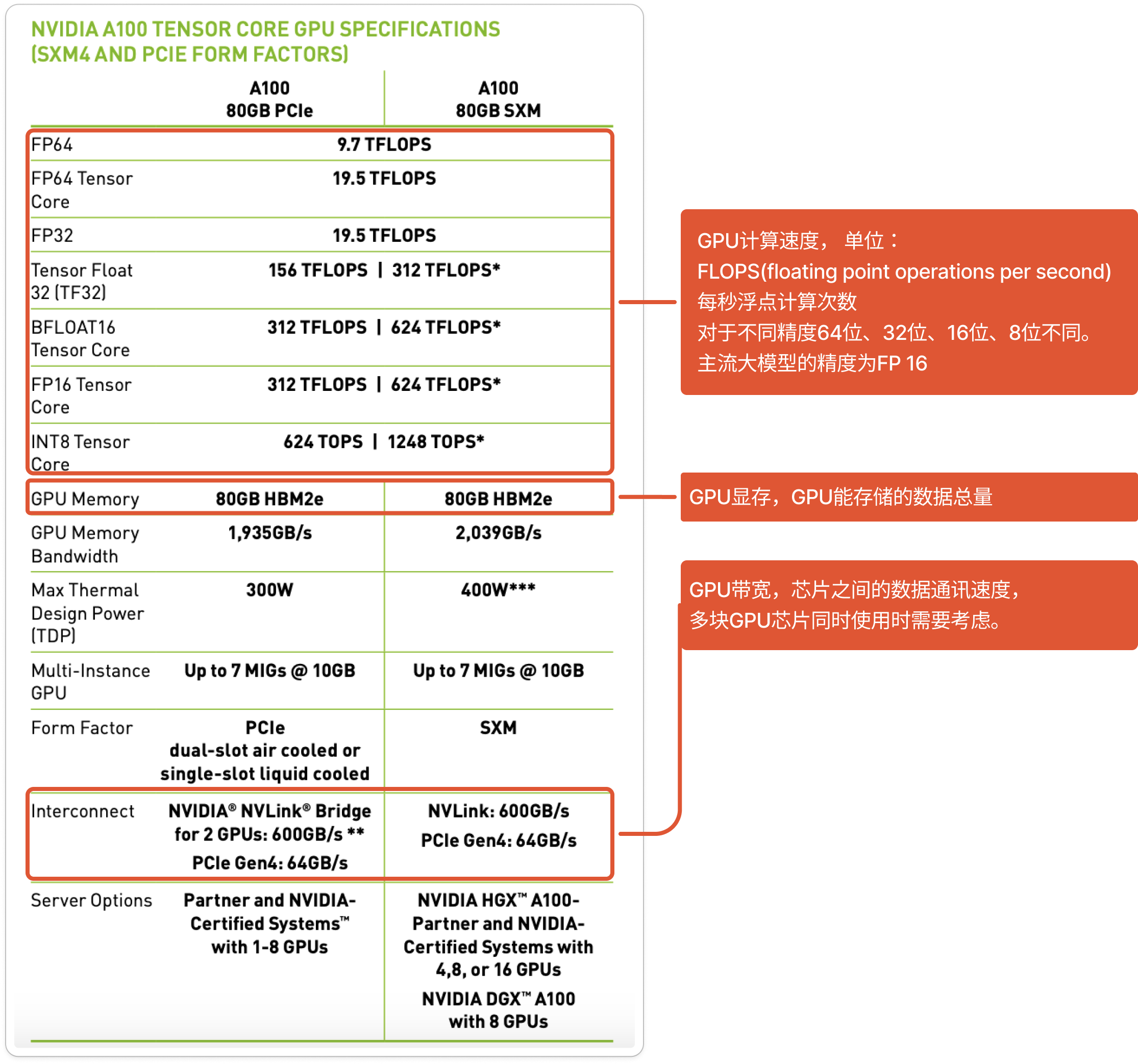 - GPU 带宽:是指卡与卡之间的数据传递速度。