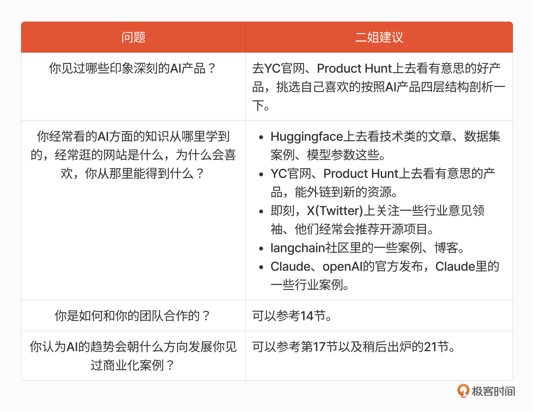 这一节课,二姐也为你来出一道面试题:在过去的一年中,让你最骄傲的一件关于AI的事情是什么呢?可以是你自己做的一个小助手,也可以是你的产品用户数有一定的突破,为什么这些事情让你骄傲,背后你做了哪些努力呢?