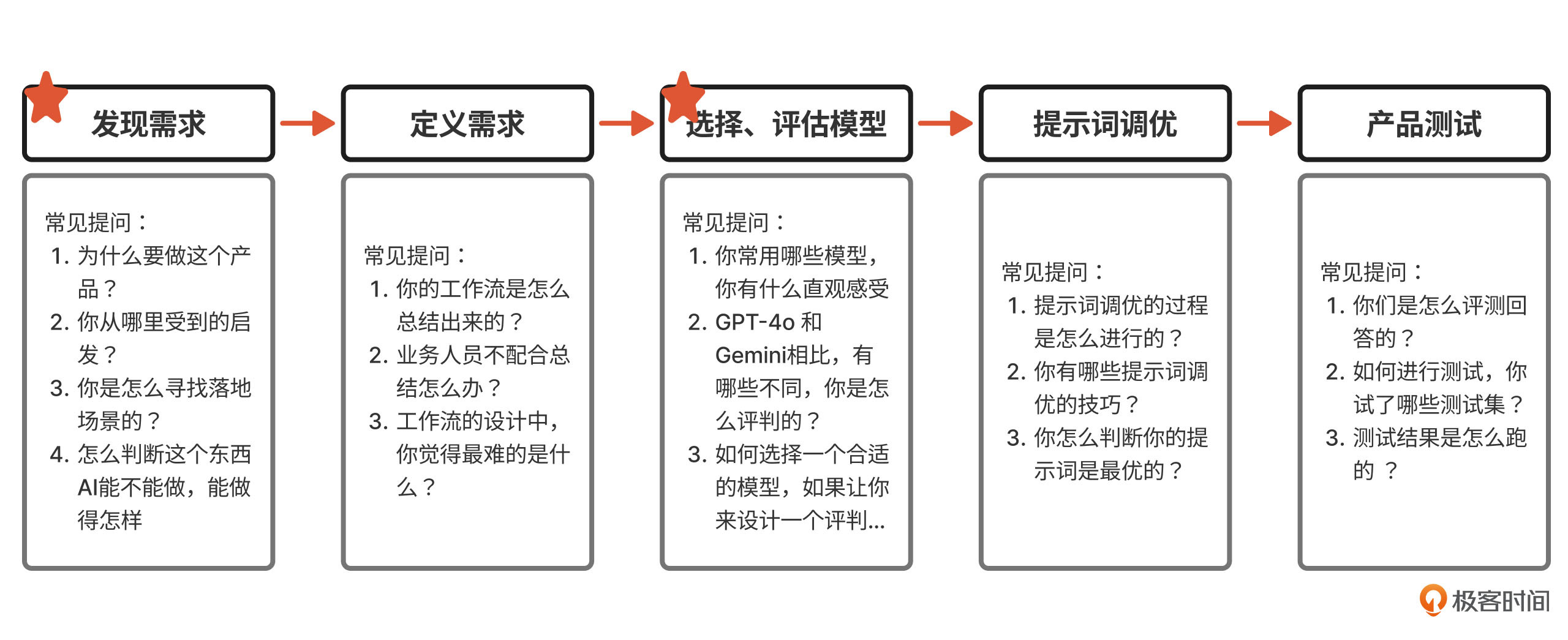 实践考察这一部分面试题,我们按照AI产品的研发流程依次来看,并在重点的地方会打上星标。不过面试并非严格按照这个顺序展开,你依据现场情况灵活应对即可。