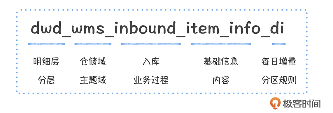除此之外,还要对表的命名进行规范化统一, 表的名称中最好能够携带表的主题域、业务过程、分层以及分区信息。比如,对于仓储域下的一张入库明细表,规则命名可以这样: