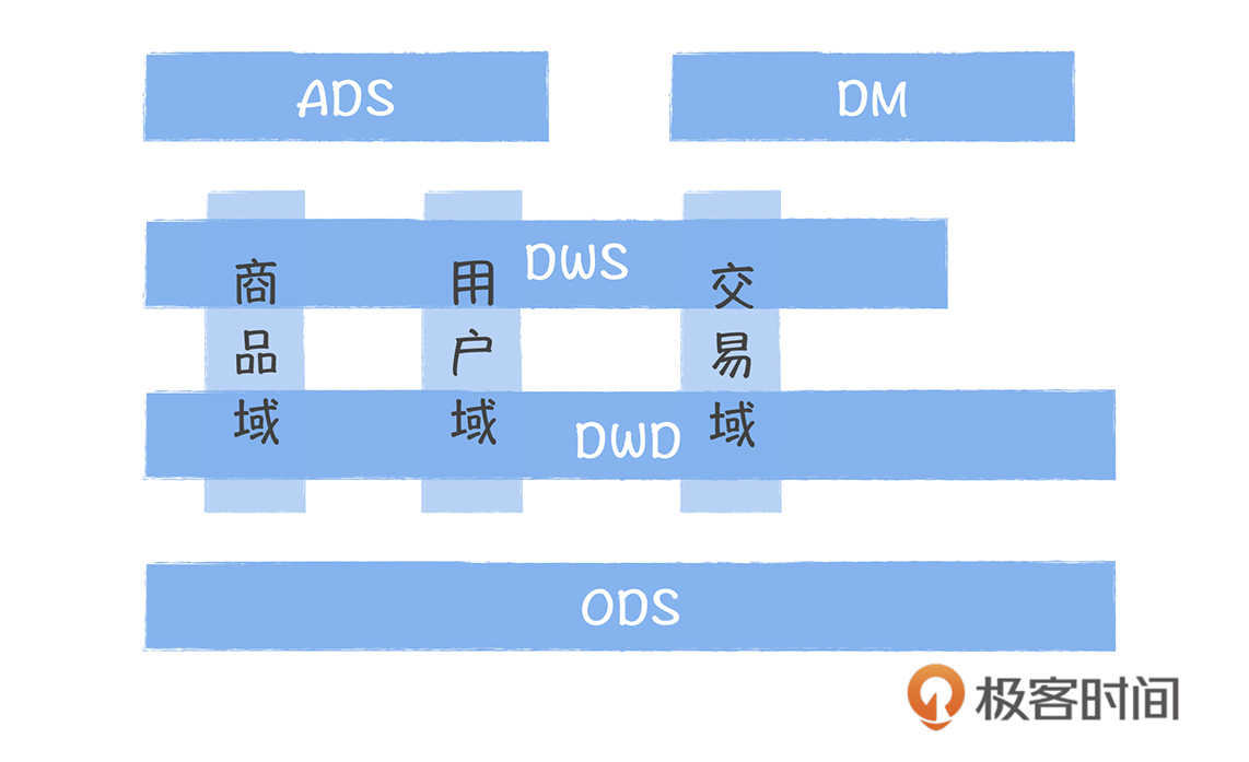 我们可以将这几万张表划到不同的主题域中,比如在电商业务中,商品、交易、流量、用户、售后、配送、供应链都可以作为主题域。好的主题域划分,是相对稳定,尽可能地覆盖绝大多数的表。