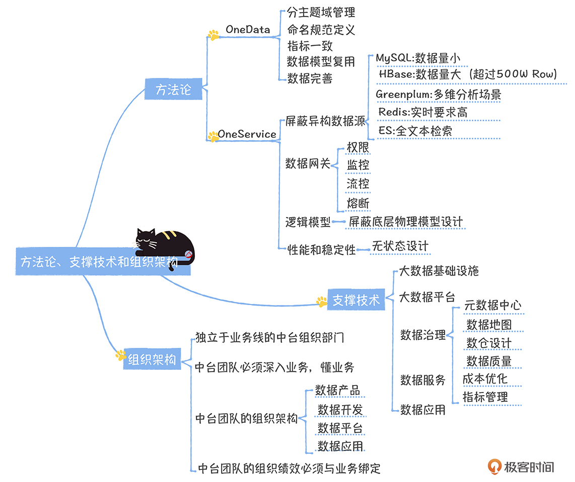 这节课,我以自己建设数据中台的经历,带领你了解了数据中台建设的三板斧:方法论、支撑技术和组织架构。在课程的最后,我想再强调几个点。