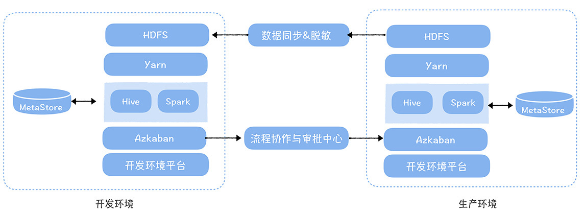 一部分来自传统企业,尤其是金融行业,他们对安全性的要求远大于对效率的诉求,严格禁止数据开发使用线上数据进行测试,他们希望有两套完全不同的环境,包括操作平台,任务在开发环境进行开发,配置任务依赖,设置稽核规则和报警,然后由运维人员进行审核后,一键发布到生产环境。当数据开发需要对数据进行测试时,可以同步生产环境的局部数据(部分分区),数据会进行脱敏。