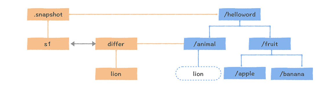 在上图中, 我们对/helloword目录启用快照,然后创建一个s1的备份。此时,在.snapshot下存在s1文件。然后我们删除/helloword/animal/lion 文件时,HDFS 会在animal 目录创建differ文件,并把diifer文件关联到s1备份,最后把lion文件移动到differ目录下。