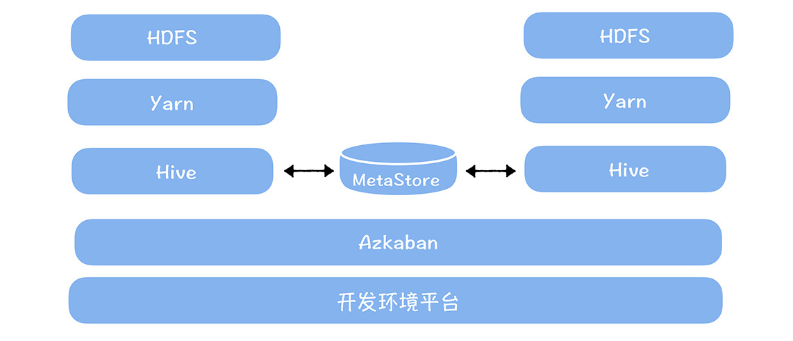 我们可以看到,大数据平台和任务调度系统(Azkaban)都是一套,然后Hive,Yarn和HDFS都是两套,两套集群通过Metastore 共享元数据。