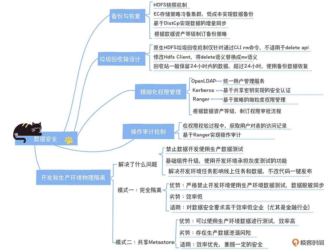 以上就是这节课的全部内容了,总的来说,我为你介绍了解决数据中台安全问题的五大制胜法宝,相信通过这些保障机制,你可以解决数据中台遇到的安全问题了。最后,我再强调几个重点: