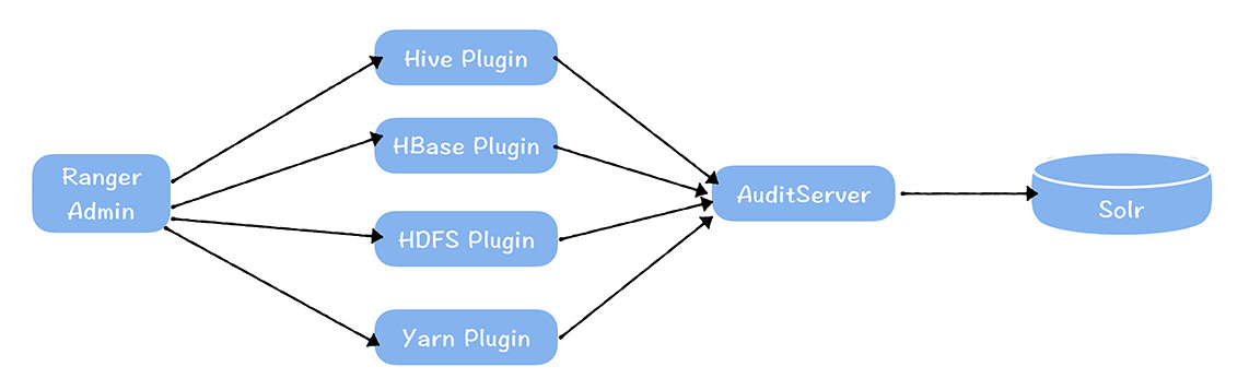 由于用户每次访问数据,都要对权限进行验证,所以在校验权限的同时,可以获取用户访问表的记录,Ranger支持审计的功能,用户的访问记录会由部署在各个服务(HDFS,HBase等等)上的插件推送到Audit Server上,然后存储在Solr中,Ranger提供了API接口查询表的访问记录。但是必须指出的是,Ranger开启Audit 后,会对服务内的插件性能产生影响。
