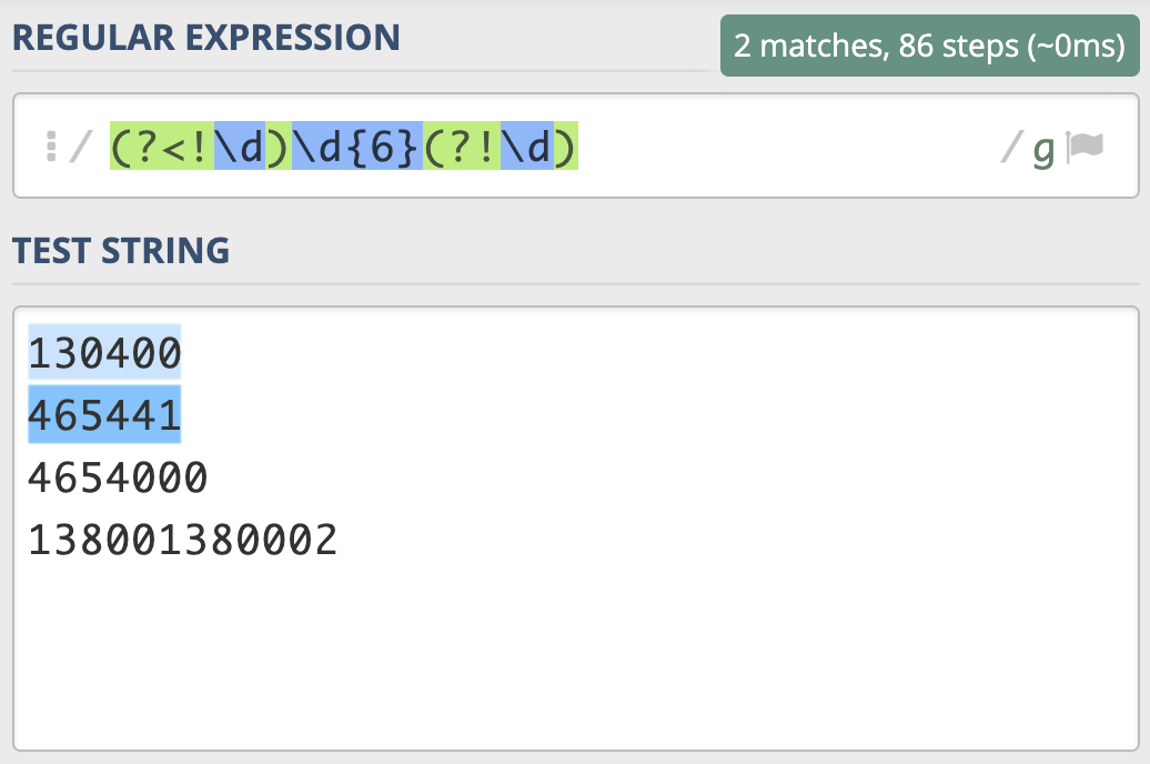因此,针对刚刚邮编的问题,就可以写成左边不是数字,右边也不是数字的6位数的正则。即 (?<!\d)\d{6}(?!\d)。这样就能够符合要求了。