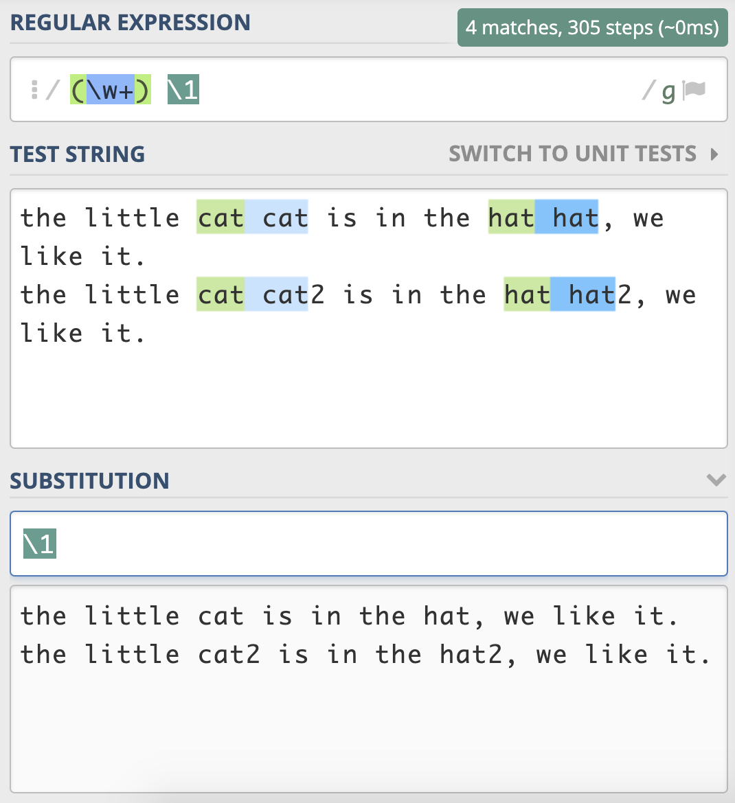 v1: 错误版本 (\b\w+\b) \1 ,实际测试还是能匹配到 cat cat2 情况,错在应该对分组后的引用\1加边界限制。