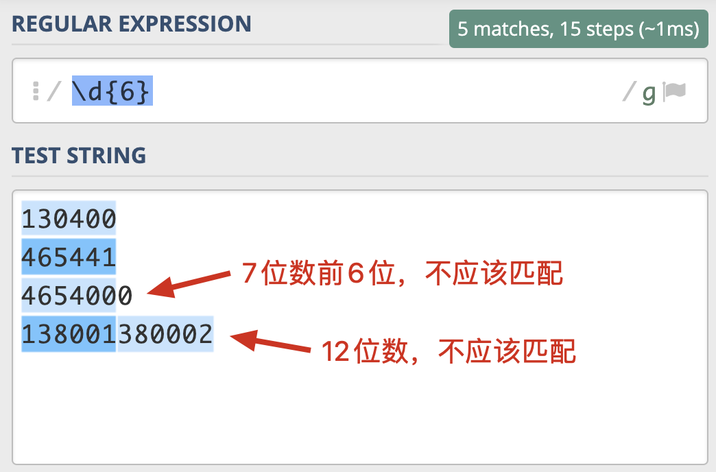 我们发现,7位数的前6位也能匹配上,12位数匹配上了两次,这显然是不符合要求的。