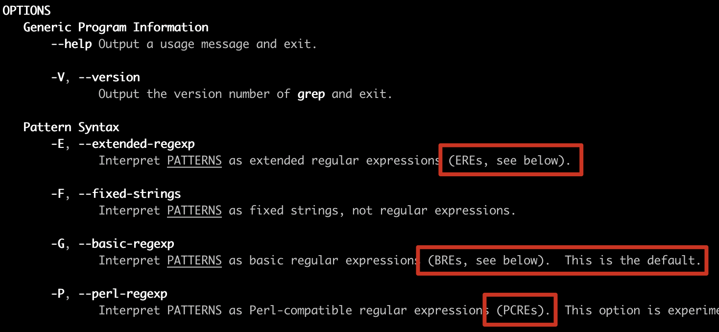 刚刚我们提到了工具对应的实现标准,其实有一些工具实现同时兼容多种正则标准,比如前面我们讲到的 grep 和 sed。如果在使用时加上-E选项,就是使用ERE标准;如果加上-P选项,就是使用PCRE标准。