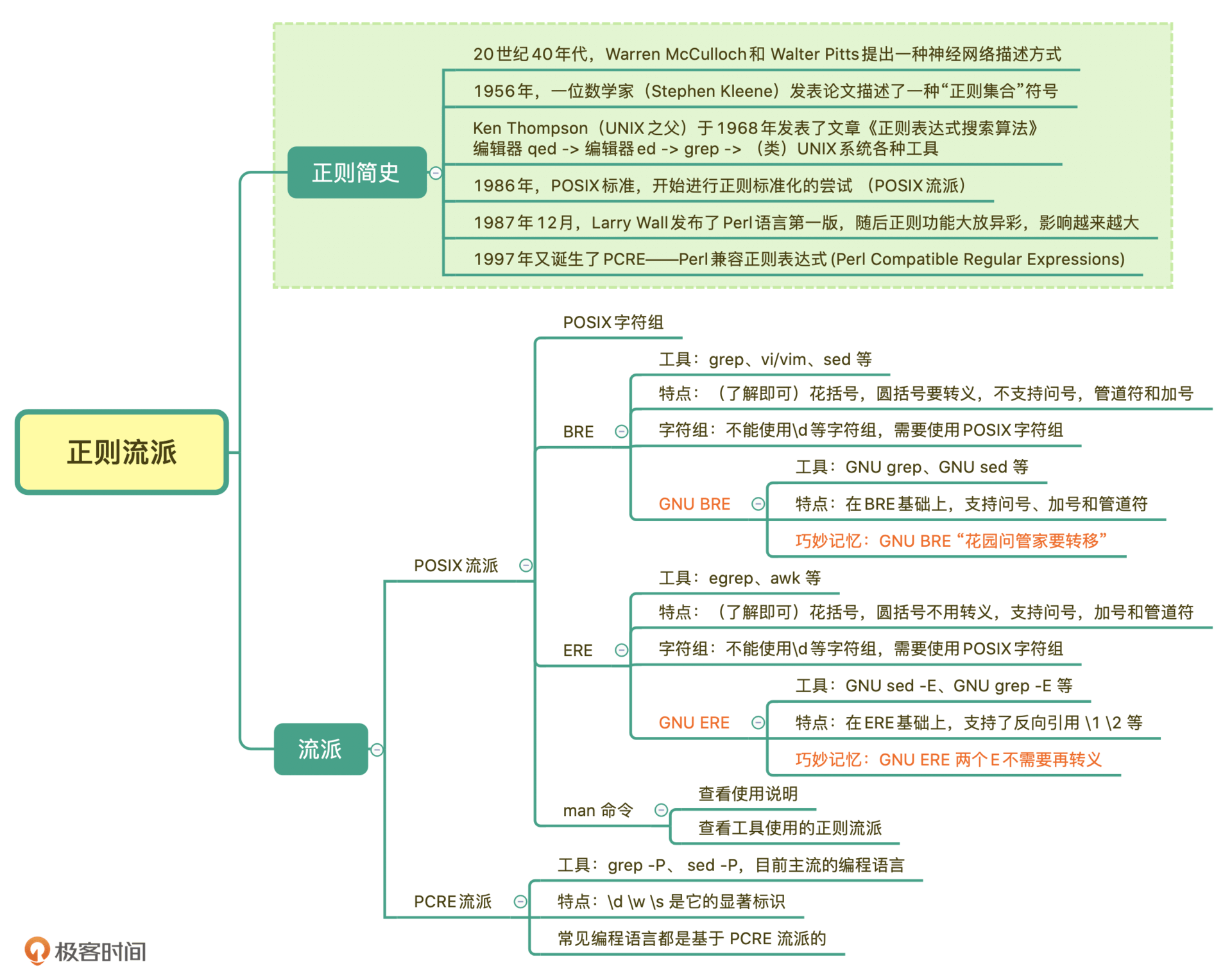 你可能要问了,讲正则流派有啥用呢?不如多来点实战啊。其实,我们去了解正则的演变过程是很有必要的。因为你一旦了解了正则的演变过程之后,就能够更加正确地去使用正则,尤其是在 Linux系统中。