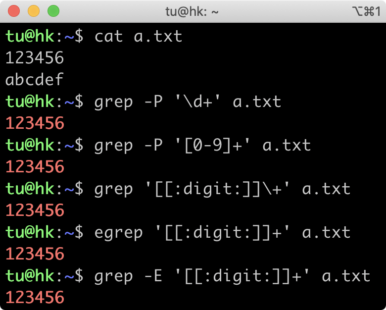 在grep命令中,你可以指定参数-P来使用PCRE流派,这样就和我们之前学习到的是一致的了。知道了原因之后,你应该能写出相应的解决方法。下图是一些能工作的方法。