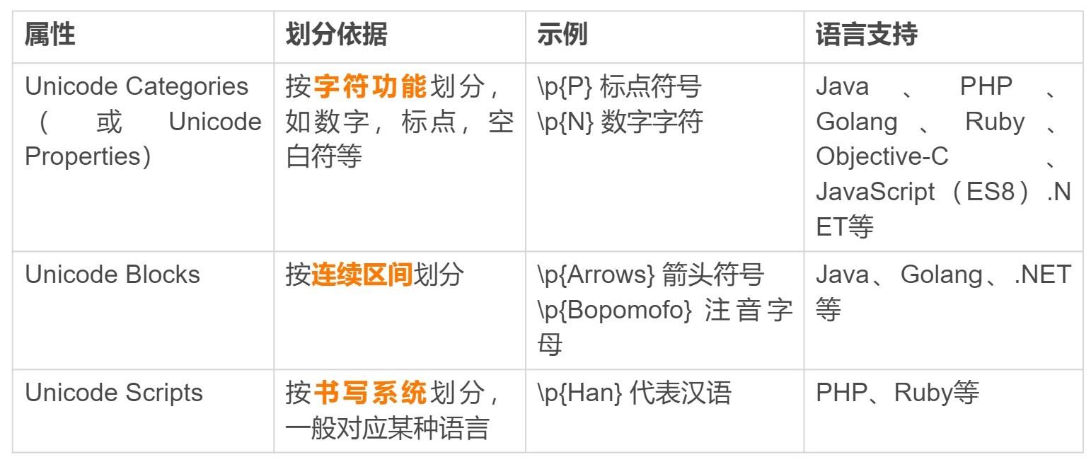 在正则中常用的有三种,分别是按功能划分的Unicode Categories(有的也叫 Unicode Property),比如标点符号,数字符号;按连续区间划分的Unicode Blocks,比如只是中日韩字符;按书写系统划分的Unicode Scripts,比如汉语中文字符。