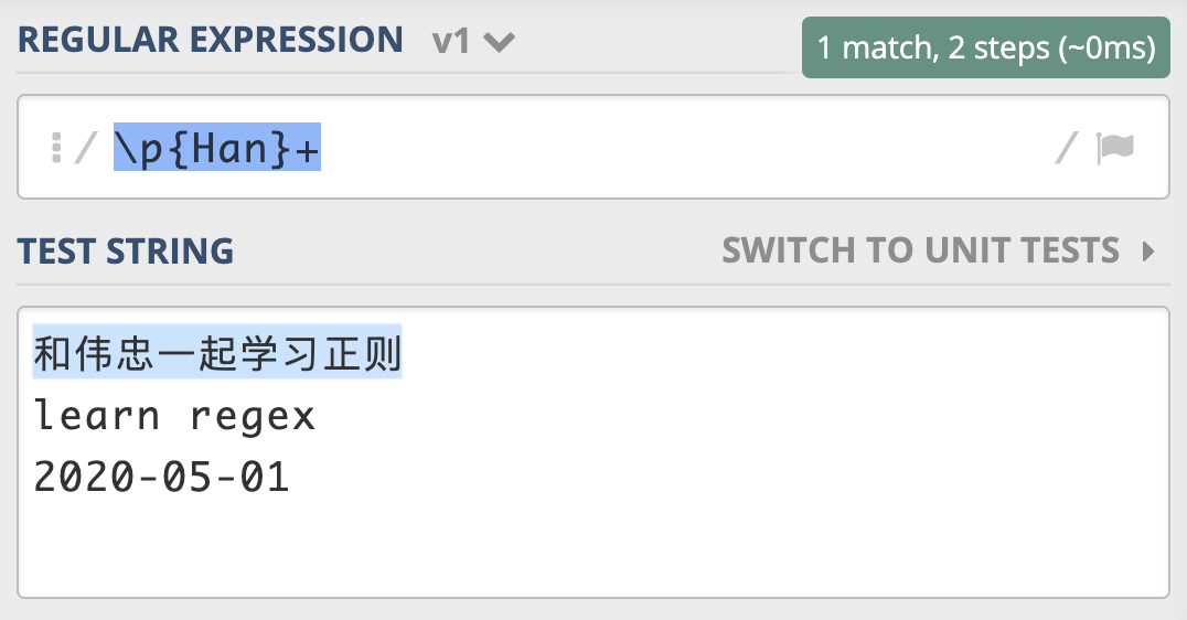 在正则中如何使用这些Unicode属性呢?在正则中,这三种属性在正则中的表示方式都是\p{属性}。比如,我们可以使用 Unicode Script 来实现查找连续出现的中文。