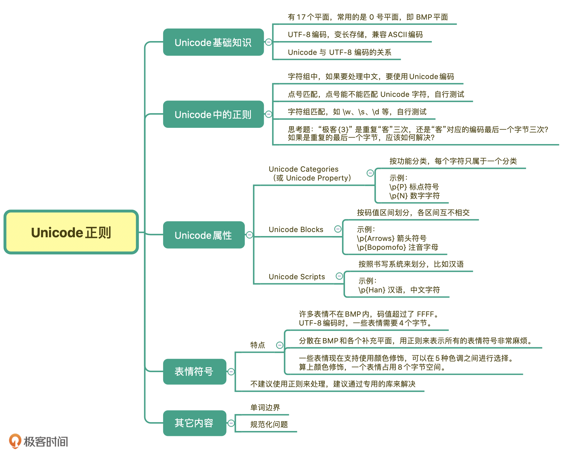 今天我们学习了Unicode编码的基础知识、了解了UTF-8编码、变长存储、以及它和Unicode的关系。Unicode字符按照功能,码值区间和书写系统等方式进行分类,比如按书写系统划分 \p{Han} 可以表示中文汉字。