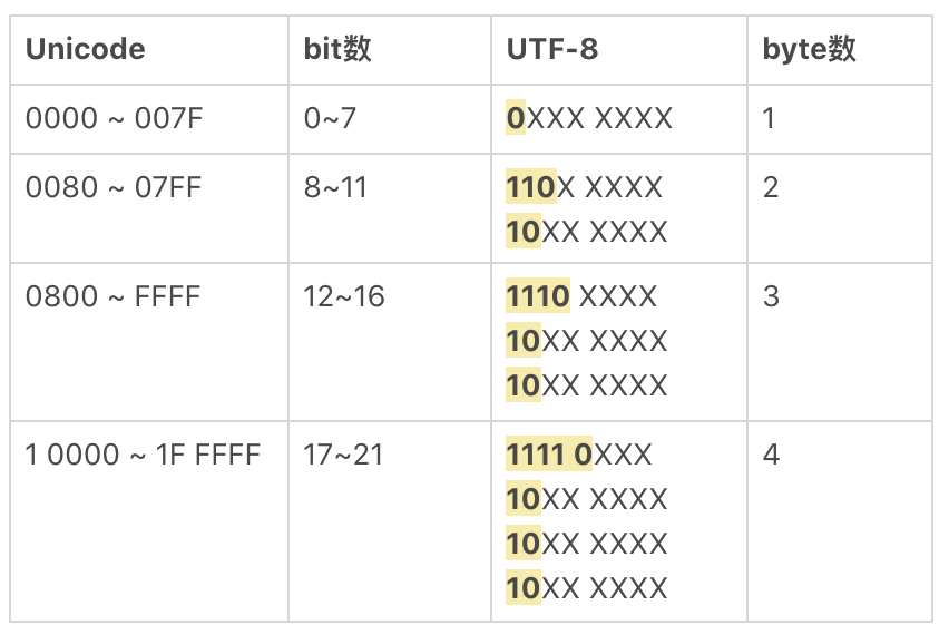 下面是 Unicode 和 UTF-8 的转换规则,你可以参考一下。