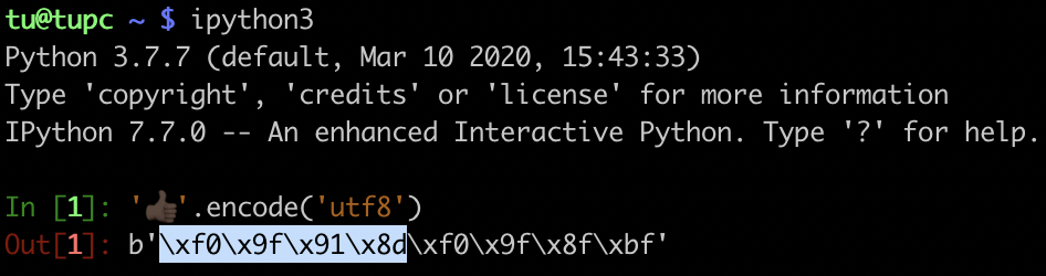 下面是使用IPython测试颜色最深的点赞表情,在macOS上的测试结果。你可以发现,它是由8个字节组成,这样用正则处理起来就很不方便了。因此,在处理表情符号时,我不建议你使用正则来处理。你可以使用专门的库,这样做一方面代码可读性更好,另一方面是表情在不断增加,使用正则的话不好维护,会给其它同学留坑。而使用专门的库可以通过升级版本来解决这个问题。