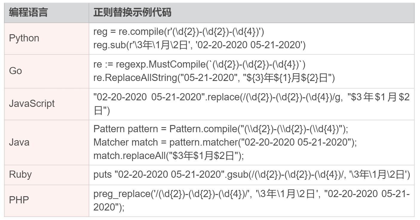 部分常见编程语言替换文本方式,你可以参考下面的表。