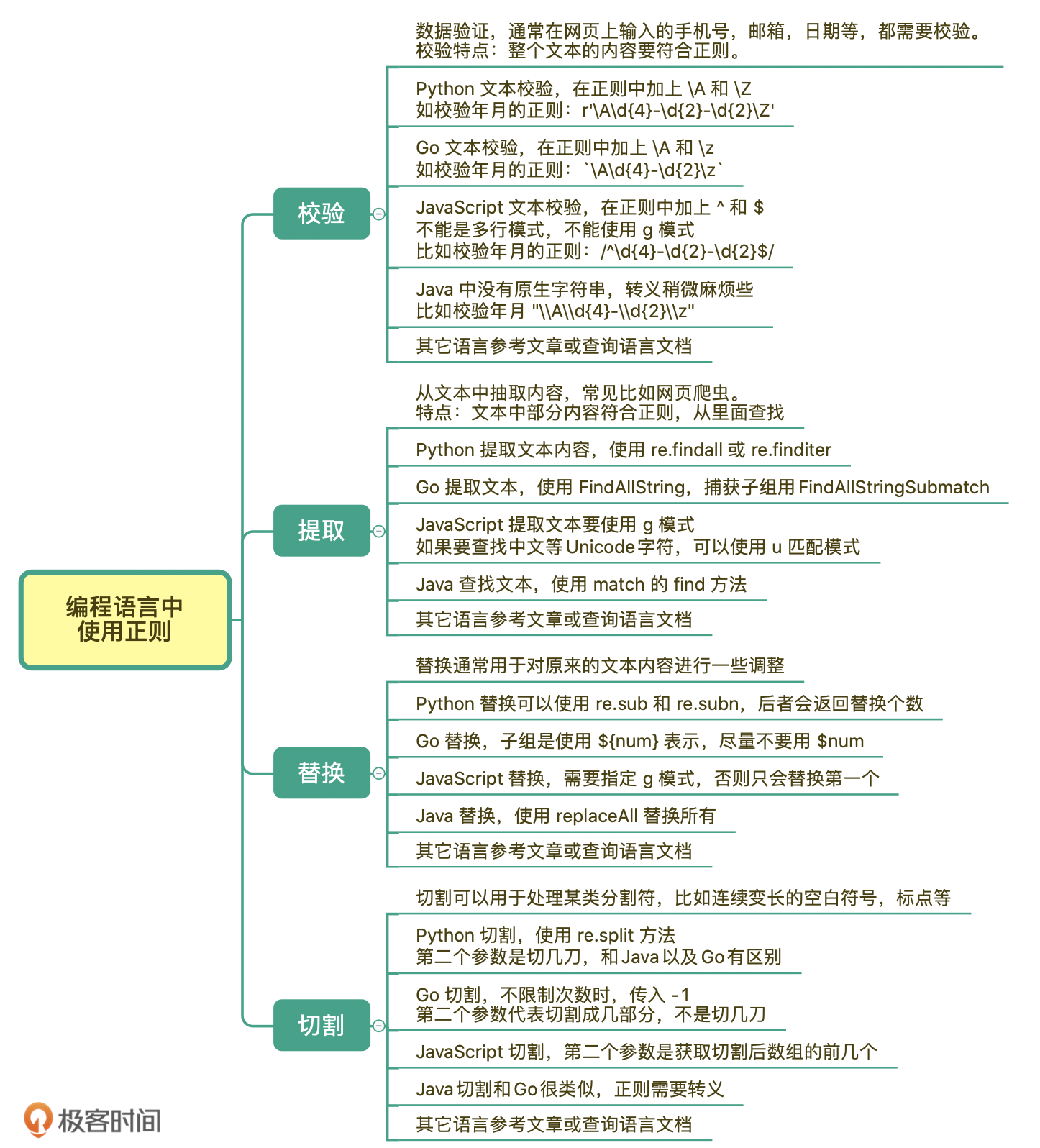 今天我们学习了正则解决的问题大概可以分成四类,分别是校验文本内容、提取文本内容、替换文本内容、切割文本内容。从这四个功能出发,我们学习了在一些常见的编程语言中,如何正确地使用相应的方法来实现这些功能。这些方法都比较详细,希望你能够认真练习,掌握好这些方法。