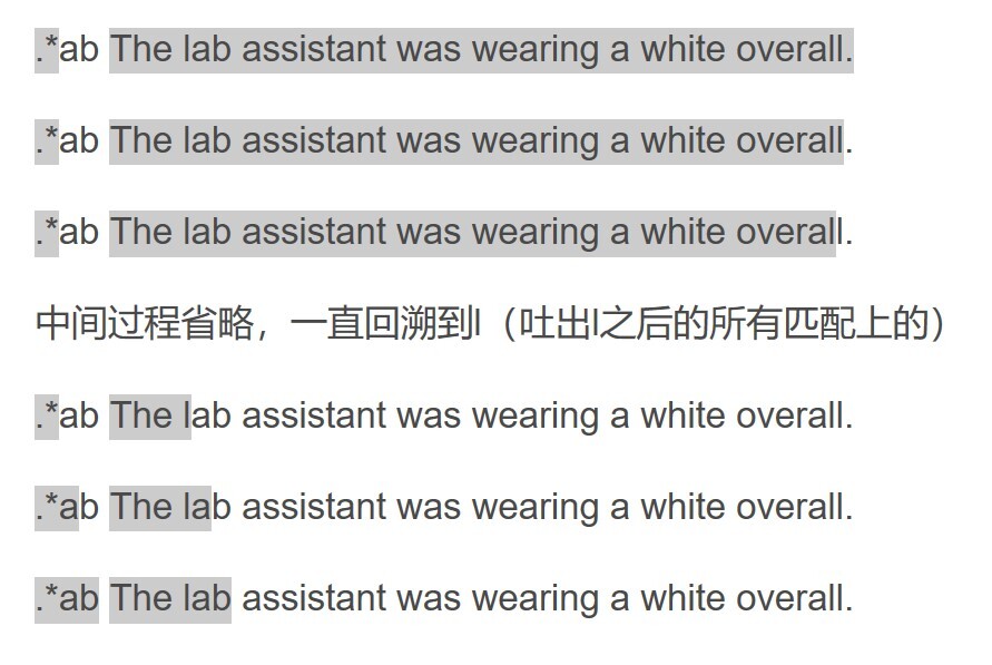 如果正则是使用 .*ab 去匹配一个比较长的字符串就更糟糕了,因为 .* 会吃掉整个字符串(不考虑换行,假设文本中没有换行),然后,你会发现正则中还有 ab 没匹配到内容,只能将 .* 匹配上的字符串吐出一个字符,再尝试,还不行,再吐出一个,不断尝试。