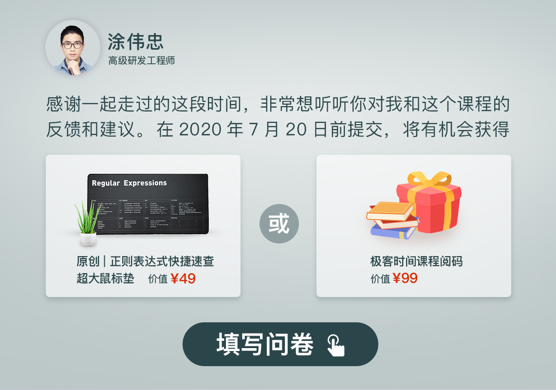 当然,我知道很多同学都喜欢“潜水”,但是在本篇专栏的最后,我希望你能分享一下你的学习方法。此外,我给你准备了一份毕业调查问卷,题目不多,希望你花两分钟填写一下,我非常想听听你对这个课程的收获和建议。最后,再次感谢!我们留言区见。