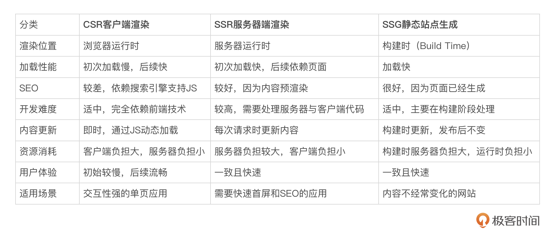你可能会好奇,SSR与PHP、ASP.NET这样的传统服务器端页面技术有什么区别?传统服务器端页面技术确实也在服务器端生成HTML,但通常不涉及现代JavaScript框架。按用途来区分,SSR用于SPA(Single Page Application)单页应用,而传统服务器端页面技术一般用于MPA(Multi-Page Application)多页应用。