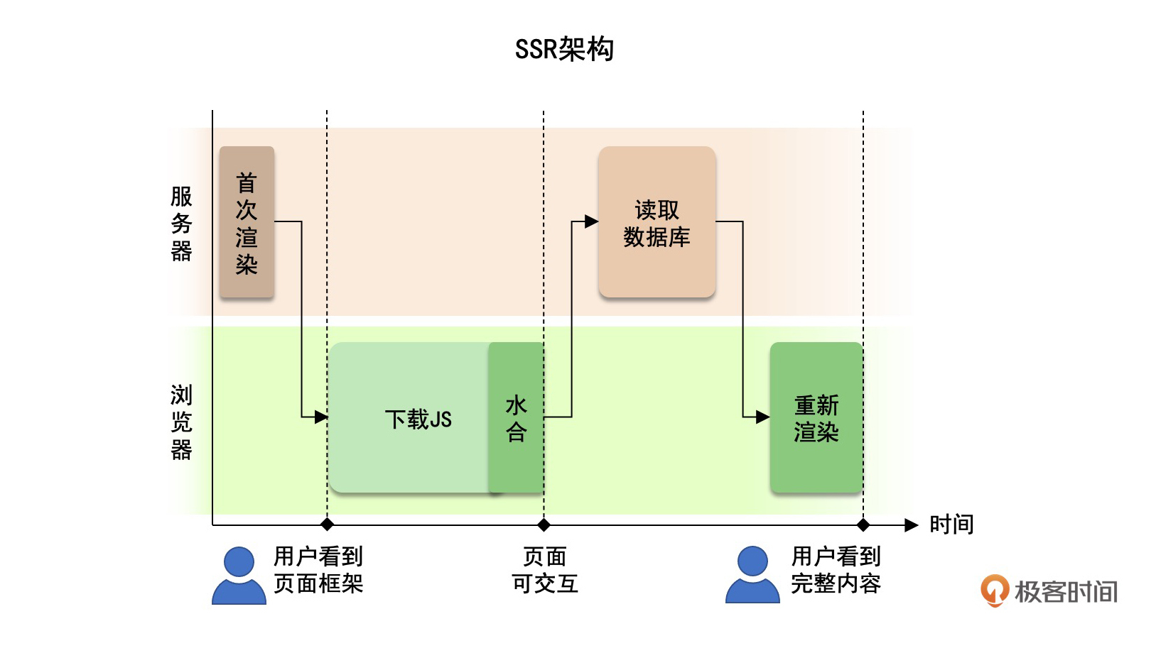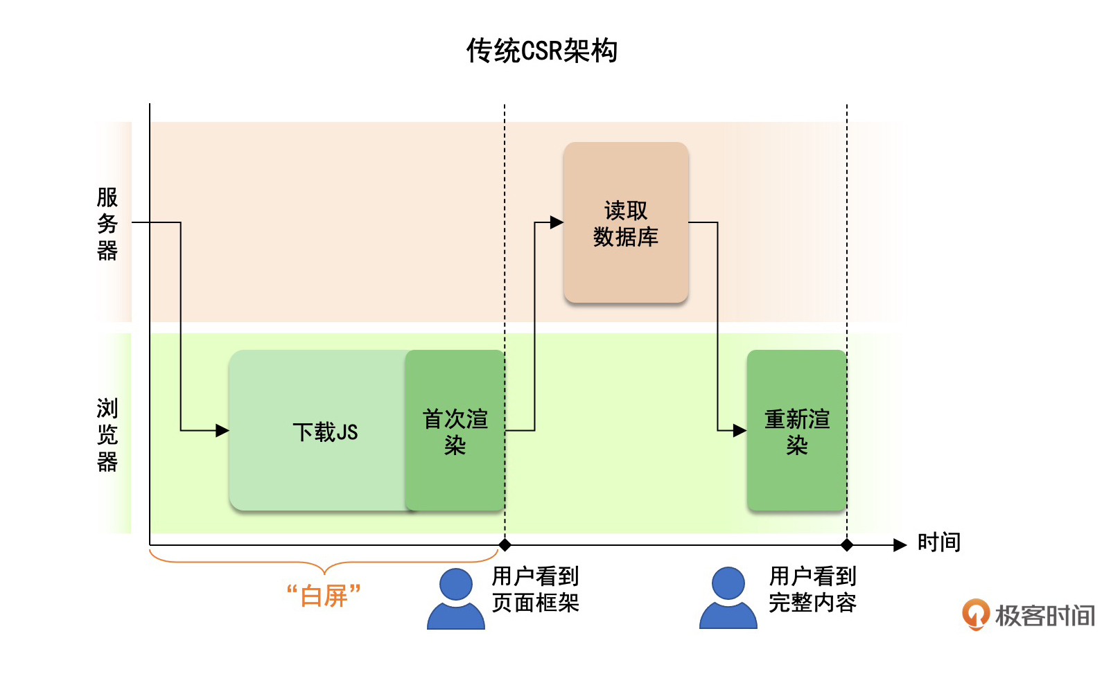 服务器端渲染(Server-Side Rendering,后文简称SSR)可以有效缓解这个问题。顾名思义,服务器端渲染可以理解成:把全部或部分渲染工作转移到服务器端。React有SSR,Vue、Angular也有SSR。不同框架实现SSR的方式不尽相同,但都能有效减少用户浏览器首次加载的白屏时间。