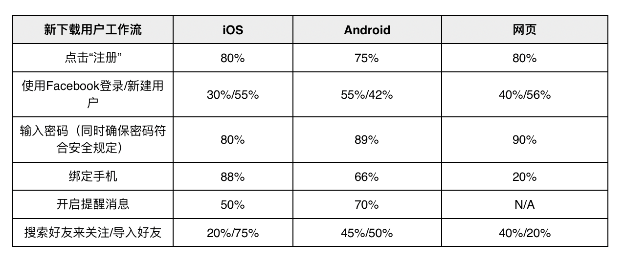 比如,80%的iOS用户下载之后点击了“注册”按钮,在点击了“注册”之后,30%的人使用Facebook登陆,55%新建用户名,剩下的15%流失了。我们这里假设,在所有用户中,iOS端用户占50%,安卓端用户占45%,网页端用户占5%。