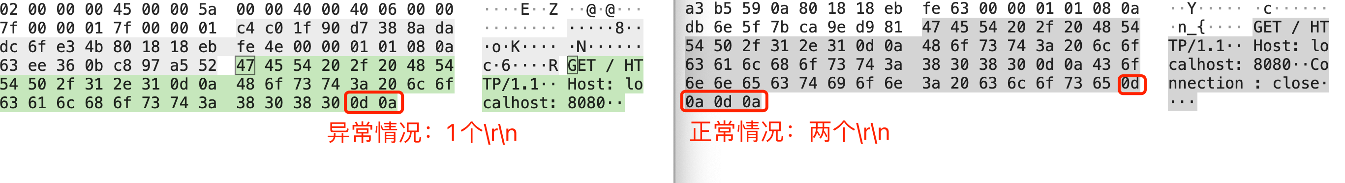 比如,在RFC规范中,HTTP请求头部(HTTP headers)和请求体(HTTP body)之间需要用两个CRLF(即两个\r\n)来分隔。但是,有些HTTP客户端没有遵循RFC规范去设置这种分隔行,自然会导致报错。这种异常,在报文列表区域或者报文详情区域是无法被发现的。但是在报文字节区域,我们可以明确看到错在哪里。比如,某些情况就是HTTP请求少了一个CRLF导致了异常。