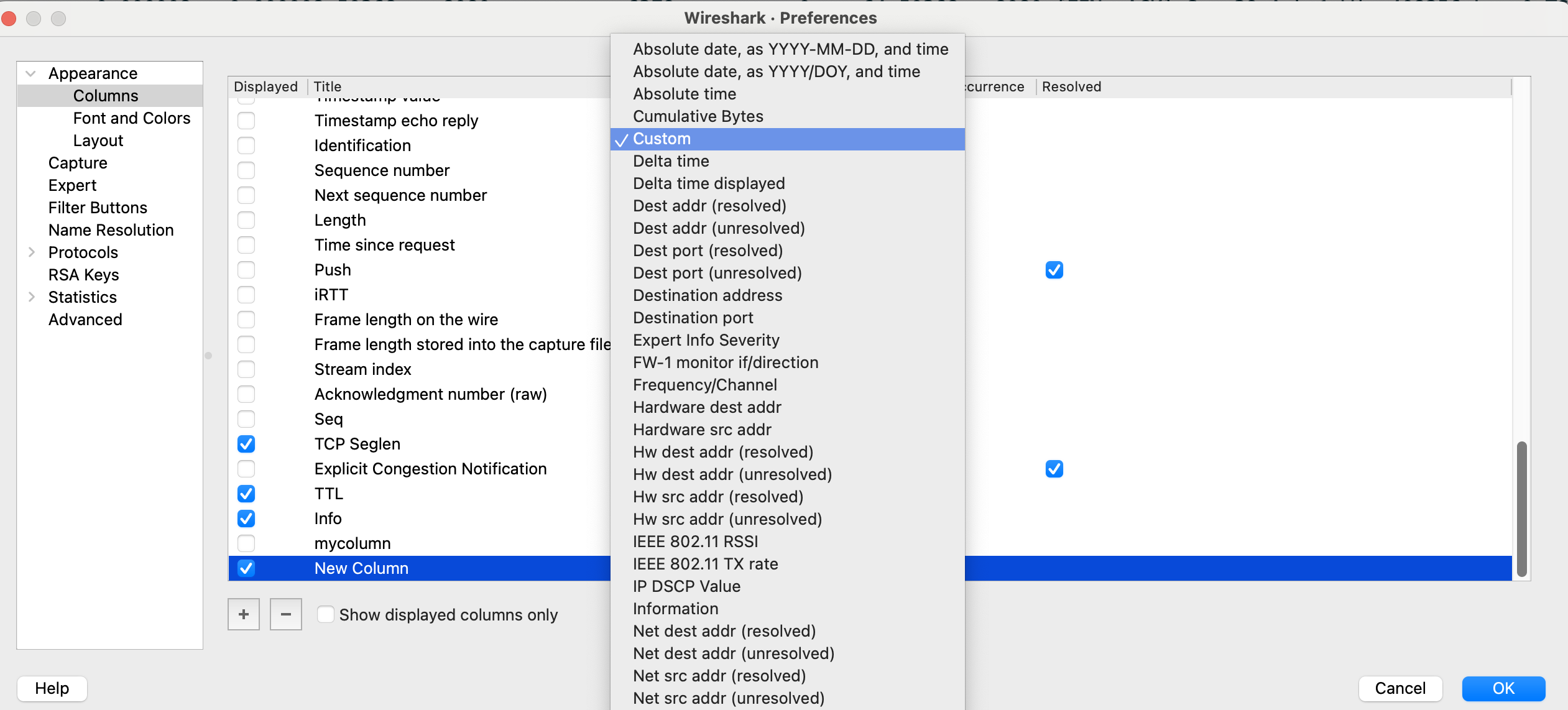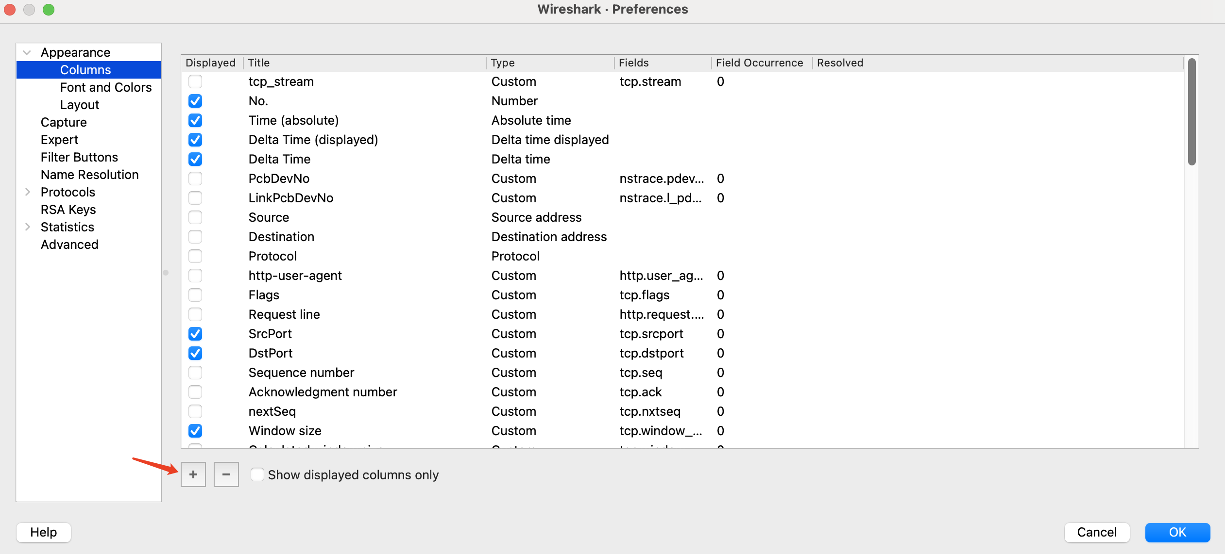 第二种是选择custom(自定义)类型,然后输入字段表达式,比如tcp.nxtseq、ip.ttl等,这就可以支持任何可选字段了。做法是,在刚才右单击弹出的菜单中,选择Column Preferences…,然后在新菜单中,点击“+”号按钮: