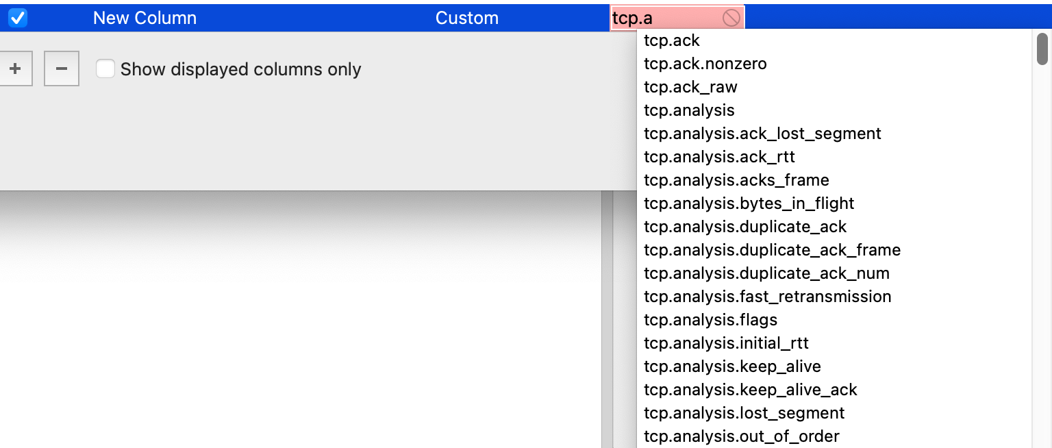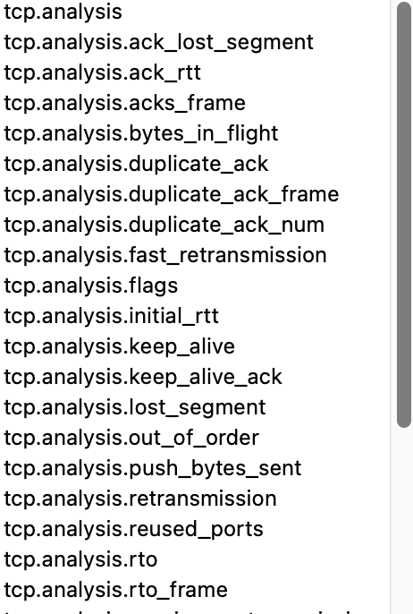 Wireshark会根据我们的输入字符串,自动展示以这个字符串开头的可用的查询语句。比如输入"tcp.a",可以看到如下query列表: