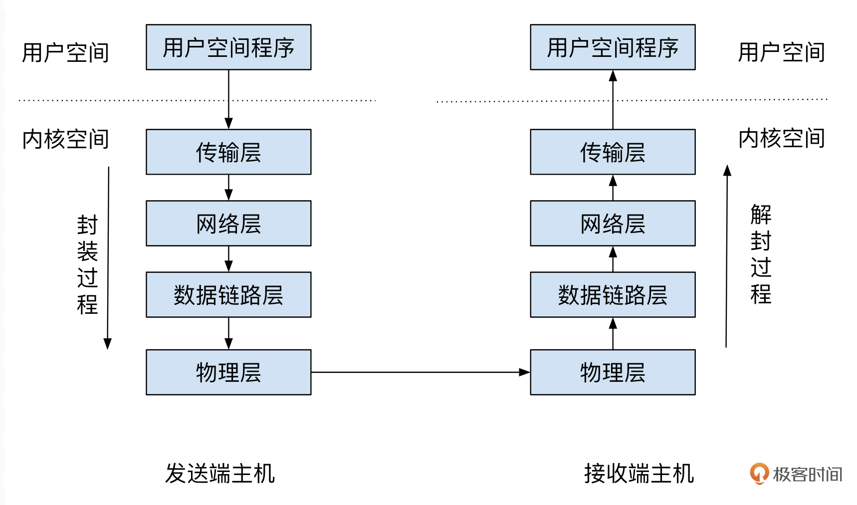 顺便提一下,对于应用由TLS加密的情况,由于内核一般不直接支持TLS的处理,所以用户空间会存在两层程序。在发送端,用户空间程序会把数据交给TLS库,后者对数据进行加密,然后把密文作为TCP的载荷,交由内核继续处理,后续过程与上图相同。接收端也进行逆向工程,内核把TCP载荷交给TLS库,后者解密后把明文转交给应用程序。