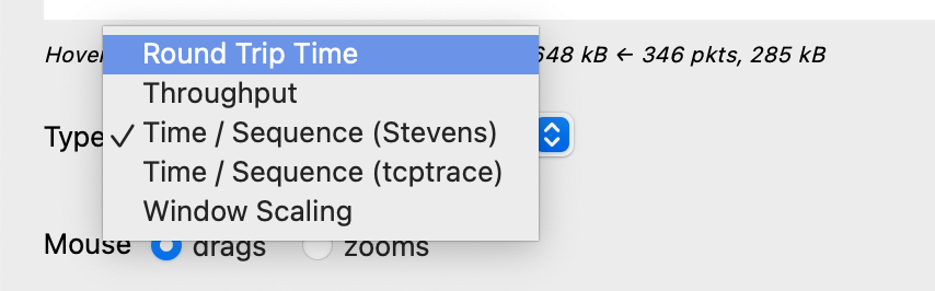 另外,你进入TCP Stream Graphs的任何一个子工具,可以在界面左下角Type这里选择切入其他子工具的。或者说这多个子工具底层是通用的,区别仅在于展示的信息不一样。