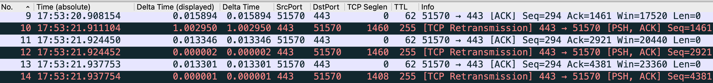 对于TCP重传和重复确认等场景,Wireshark的配色方案是黑底红字。比如下面的报文10、12、14都是TCP重传报文,一般意味着网络状况不稳定,有丢包的情况发生。